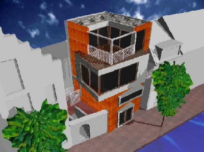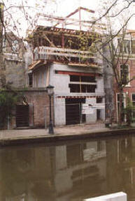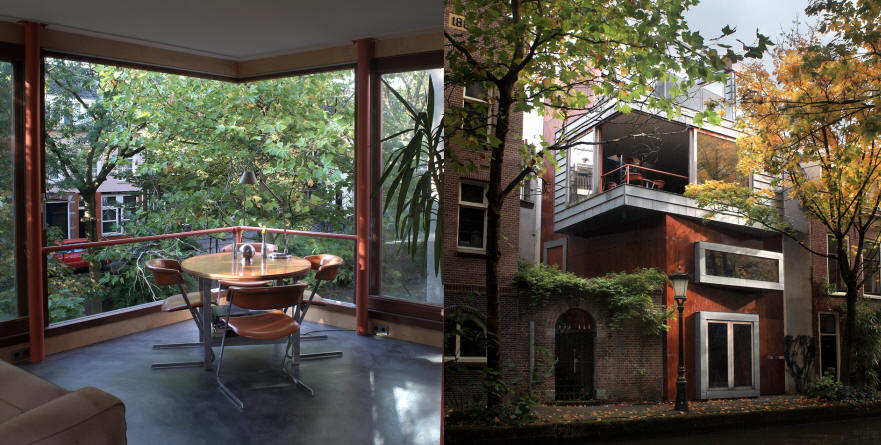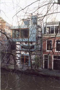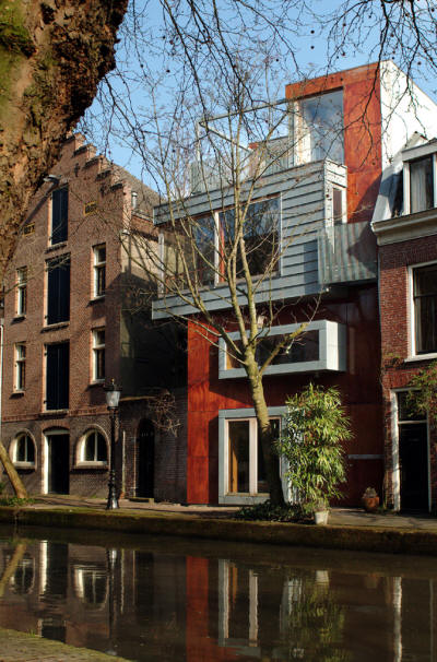 en functie De gevelgeleding wordt bepaald door de functies van achterliggende ruimten. De ruimte aan de werf is bedacht als werkruimte en heeft daarom een, wat meer, gesloten karakter en twee functioneel openslaande deuren naar de werf. Op de eerste bouwlaag bevindt zich aan de zijkant, in de steeg, de hoofdentree en de slaapkamer plus sanitaire voorzieningen. Het "landschapsformaat" raam op deze bouwlaag, is speciaal ontworpen voor de slaapkamer. Het idee is dat je vanuit bed over de gracht kan uitkijken. De derde bouwlaag vormt als geheel het hoofdwoonvertrek met open keuken. De uitkraging van de bouwlaag tekent zich in de gevel duidelijk af en biedt mede door het niveau boven de werf een ruim uitzicht in de lengterichting van de gracht. Een ruim twee meter hoog schuifraam is zodanig uitgevoerd dat de rechterhoek van het woonvertrek volledig geopend kan worden zodat de door de architectuur gedefinieerde hoek verdwijnt. Door deze truc, wordt het woonvertrek transparant, ruim en krijgt het een licht karakter. De vierde bouwlaag bevindt zich weer binnen de basisvorm van het grondvlak van zes bij zes. Hier bevindt zich een dakterras en een extra slaapkamer. De rechthoekvorm van de toren is boven het dakterras weer herkenbaar in een verzinkte stalen randbalk.
